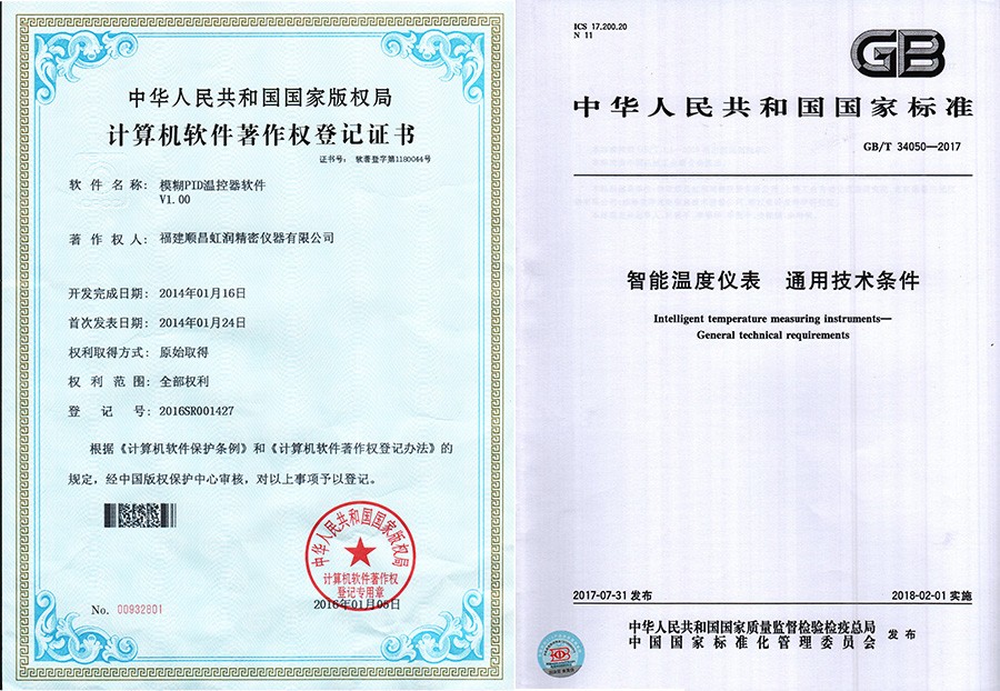 虹潤公司模糊PID溫控器是虹潤公司應用自主知識產(chǎn)權開發(fā)的新一代智能控制儀表,產(chǎn)品榮獲模糊PID控制儀及控制方法(專利號2015109378814)、一種智能化控制器及自整定方法(2016103155465)2項國家發(fā)明專利,傻瓜式模糊PID調(diào)節(jié)儀軟件V1.00(版權登記號2015SR171602)、模糊PID溫控器軟件V1.00(版權登記號2016SR001427)2項軟件著作權,主持起草《智能溫度儀表 通用技術條件 GB/T 34050-2017》《工業(yè)過程控制系統(tǒng)用模擬輸入兩位或多位輸出儀表第2部分:檢查和例行試驗導則》2項國家標準。其中《工業(yè)過程控制系統(tǒng)用模擬輸入兩位或多位輸出儀表第2部分:檢查和例行試驗導則》標準正在起草中。